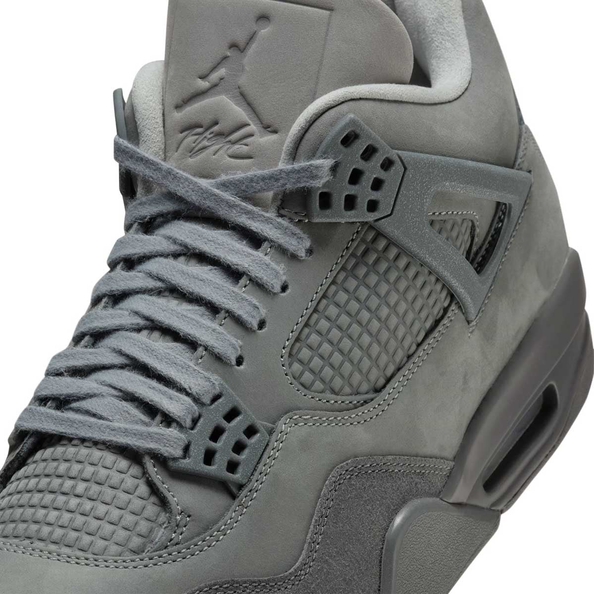 This 'Wet Cement' edition of the AJ4 draws inspiration from the cobblestone streets of Paris, evoking their rustic yet sophisticated aesthetic. A mix of nubuck leather and suede gives these grey hues some texture and dimension, making this monochromatic shoe fit for any "rue" or avenue.